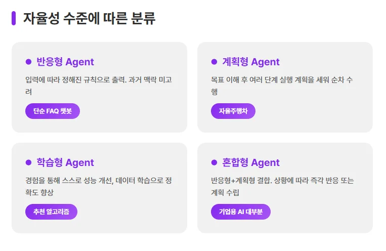 AI Agent를 '얼마나 스스로 판단하고 실행하는가'를 기준으로 나누면 네 가지로 구분됩니다.