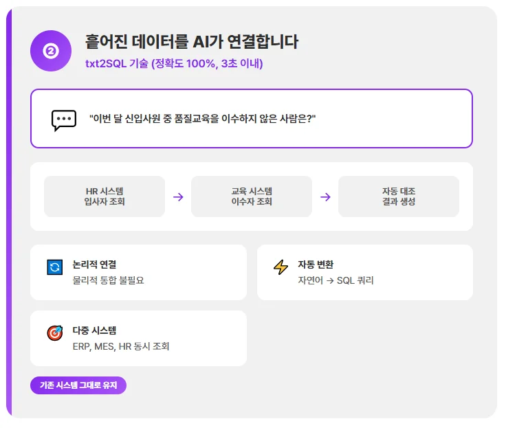 다비스의 txt2SQL 기술은 이 문제를 해결합니다. 자연어 질문을 SQL 쿼리로 자동 변환해(정확도 100%, 응답 3초 이내) 여러 시스템의 데이터를 논리적으로 연결합니다.