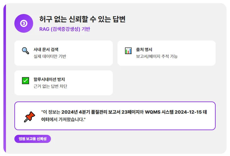중요한 것은 답변의 근거를 명시하는 기능입니다. "이 정보는 2024년 3분기 품질관리 보고서 17페이지에서 가져왔습니다"처럼 출처를 제공하면, 경영진 보고용으로도 신뢰할 수 있는 데이터가 됩니다.