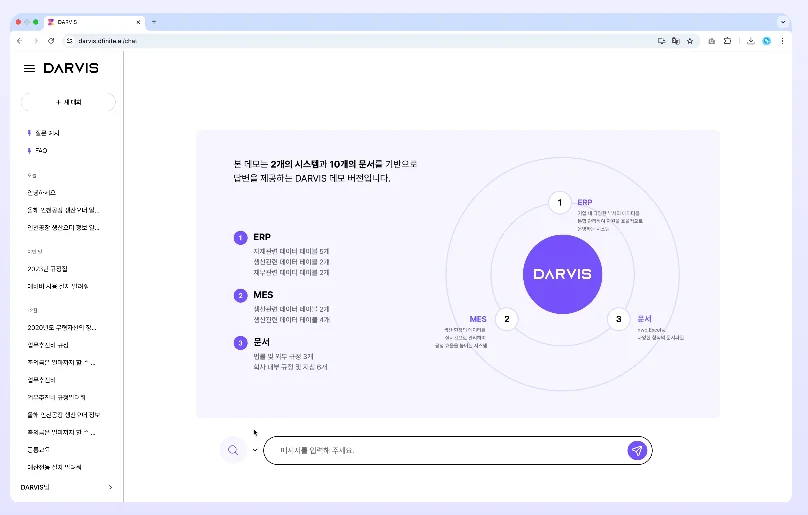 다비스(DARVIS)는 단순한 챗봇이 아니라 '기업 데이터 인텔리전스 시스템'입니다. 사내에 흩어진 여러 시스템(ERP, MES, HR, 품질관리 등)의 데이터를 물리적으로 통합하지 않고, AI가 논리적으로 연결해 자연어로 질문하면 즉시 답변을 제공합니다.
