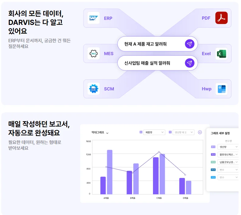 이 질문을 던지면 다비스(DARVIS)는 자동으로 SQL 쿼리를 생성해 ERP 데이터베이스를 조회합니다. SQL을 모르는 현업 담당자도 실시간으로 데이터를 확인할 수 있습니다.