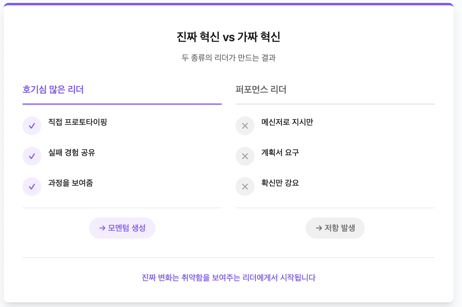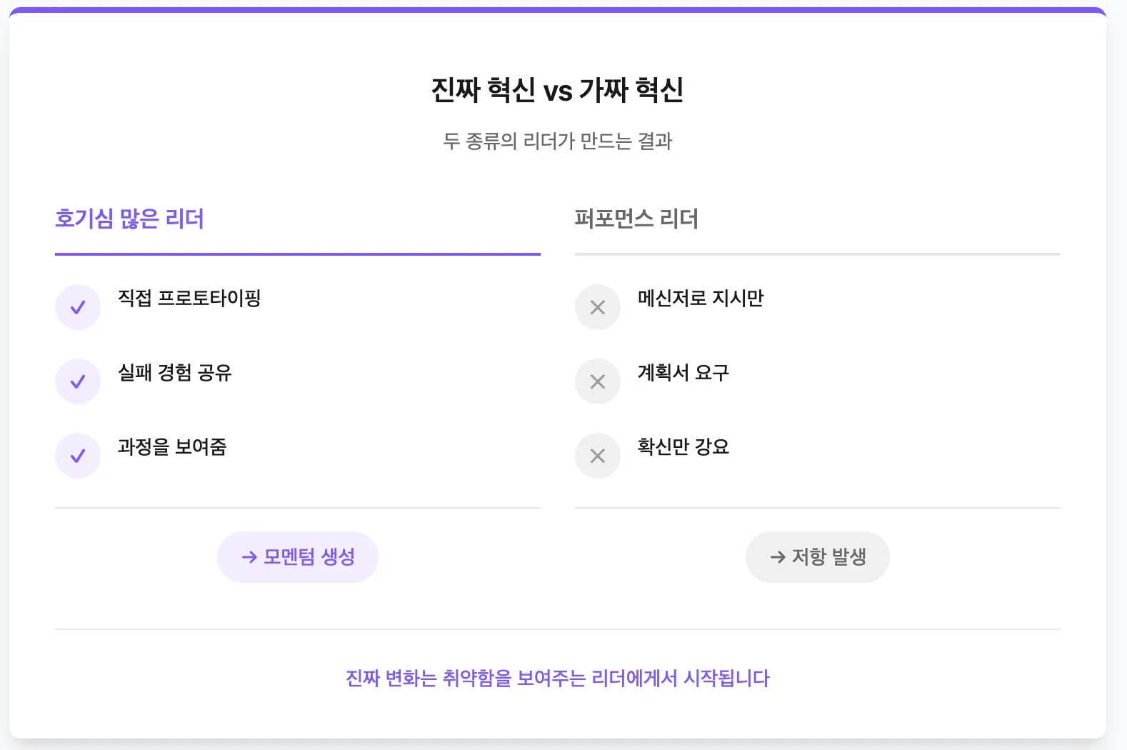 차이점은 명확합니다. Top-down으로 강제된 혁신과 Bottom-up으로 자생한 혁신의 생존율은 확연히 다릅니다.