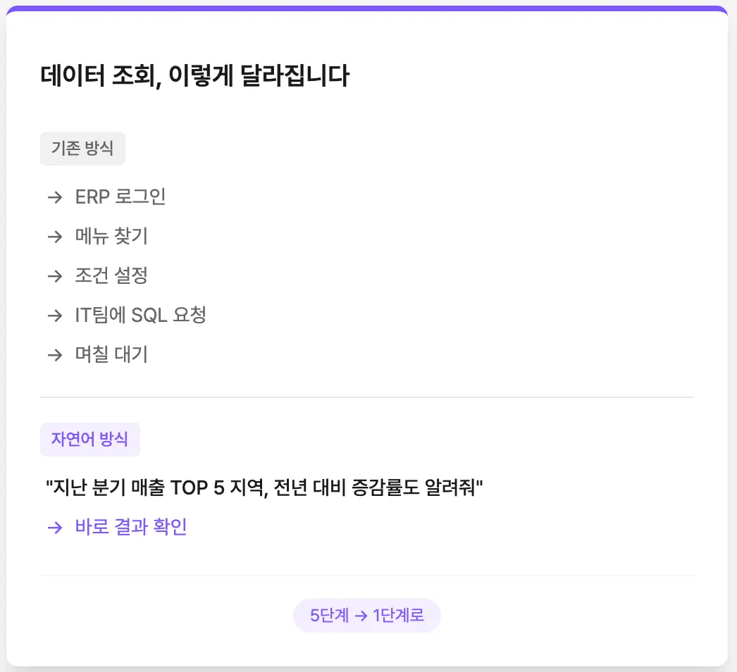 자연어 방식: 마케터가 '지난 분기 지역별 매출 보여주고 이상치 표시해줘'라고 입력 → 시스템이 바로 결과 제공 → 추가 질문도 즉시 가능