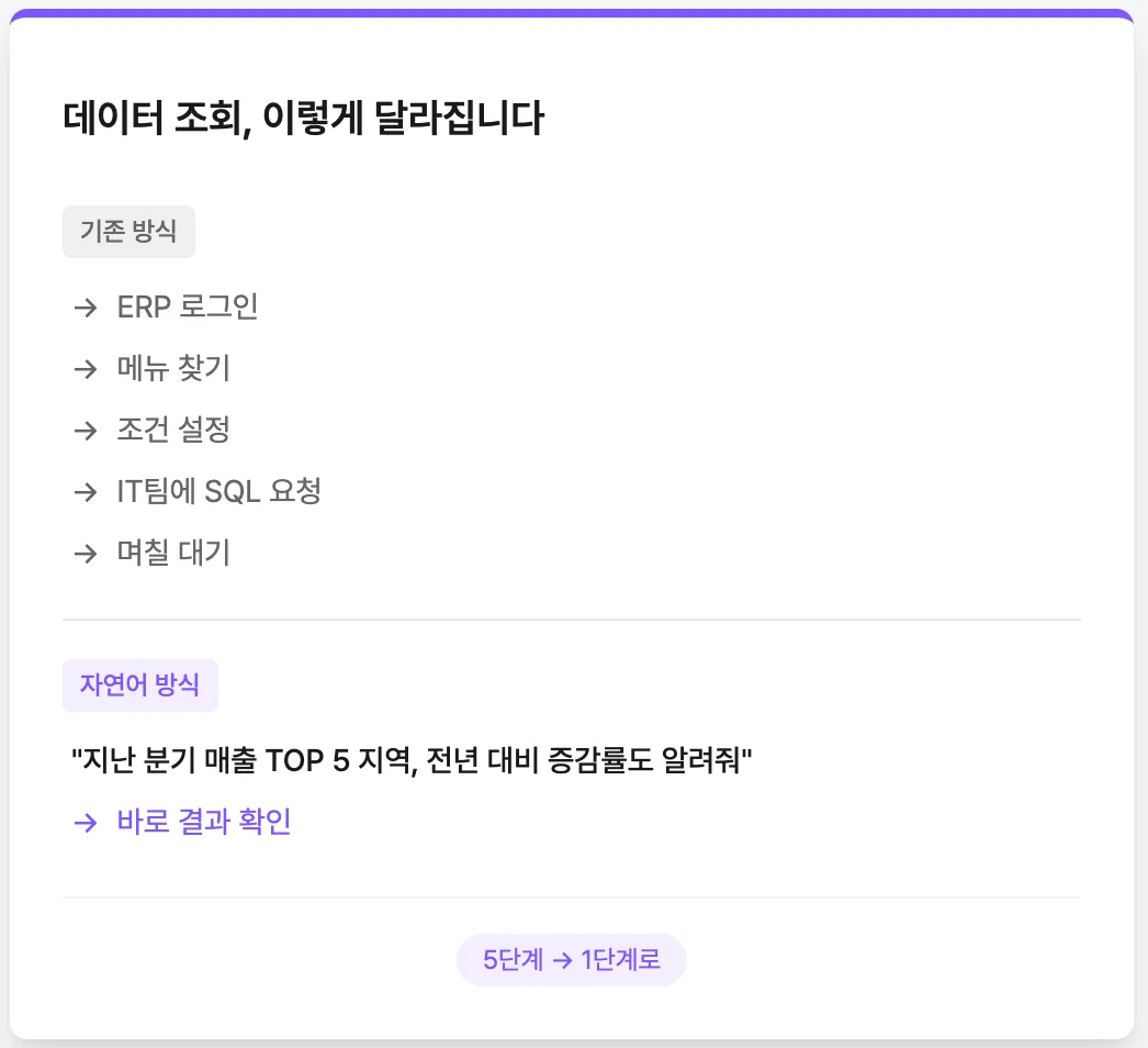 기존 방식: 마케터가 지역별 매출 분석을 하려면 IT팀에 요청 → IT팀이 SQL 작성 → 결과 전달 → 마케터가 확인 → 추가 질문이 있으면 다시 요청