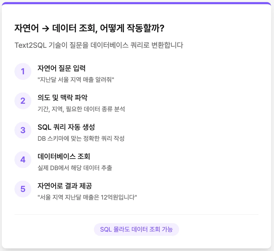 사용자가 자연어로 질문하면, AI가 이를 해석해서 실제 데이터베이스 쿼리로 변환합니다. 이 기술을 Text2SQL이라고 부릅니다.