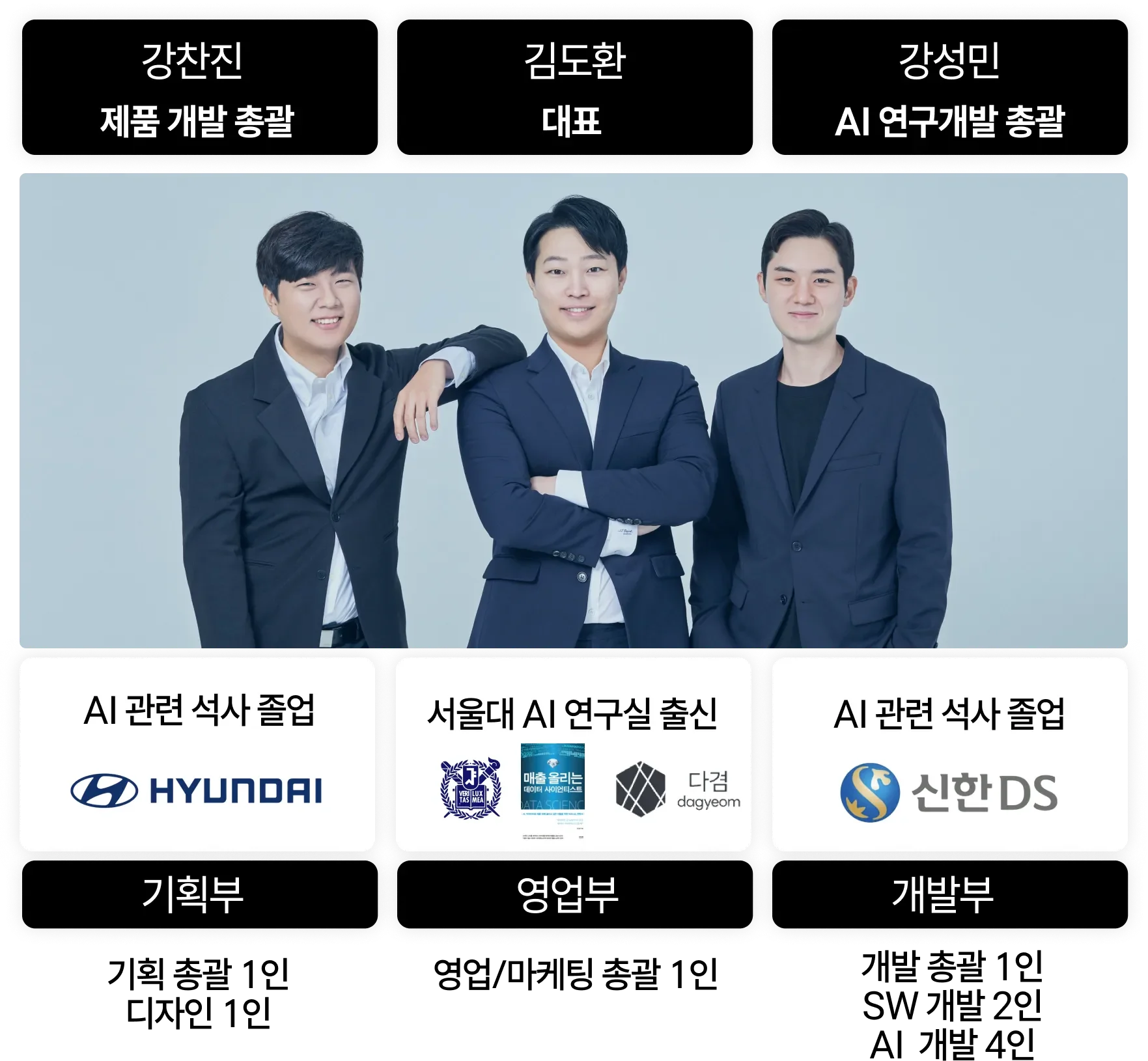 디피니트는 ‘기술은 사람의 시간을 돌려주는 도구’라는 믿음으로 2023년 7월에 설립되었습니다. 현재 10명의 팀원이 함께하고 있으며 대표를 포함한 3명의 창업자(9년차 AI 엔지니어)와 AI 개발자 4명, SW 개발자 2명, 디자이너 1명으로 구성되어 있습니다.