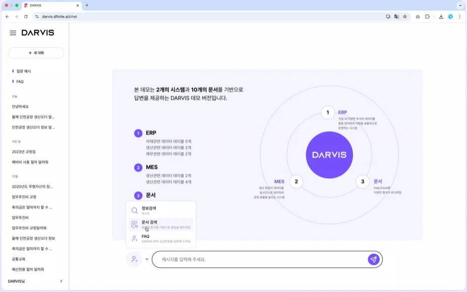 다비스(DARVIS)는 단순한 챗봇이 아니라 기업 데이터 인텔리전스 시스템입니다. 매출 2,000억 원 규모의 자동차 부품 제조기업 W사에 실제로 도입되어, 다음과 같은 분산 시스템을 통합했습니다.