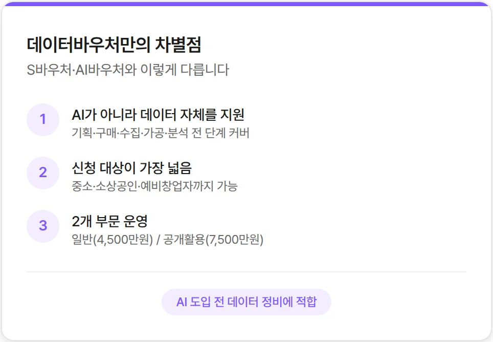 금액만 보면 AI바우처(최대 2억원)나 S바우처(최대 1억원)보다 작지만, 그만큼 진입장벽이 낮습니다. AI 솔루션 도입처럼 큰 규모의 프로젝트가 아니라, 데이터 정비나 분석 같은 비교적 작은 규모의 과제를 시작하기에 적합합니다.