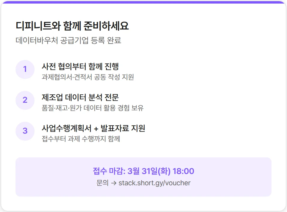 S바우처(3.27 마감), AI바우처(3.30 마감)와 비교하면 데이터바우처가 가장 늦게 마감돼요. 하지만 사전 협의 과정이 필수이기 때문에, 실질적인 준비 시간은 다른 바우처와 크게 다르지 않습니다. 데이터바우처의 접수 마감은 2026년 3월 31일(화) 18:00입니다.
