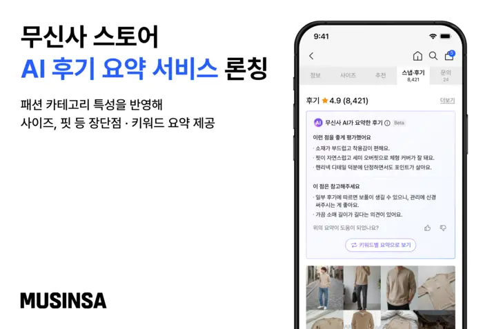 리뷰 기반 정보 제공도 특징입니다. 수많은 리뷰를 분석해 "정사이즈보다 작아요", "색감이 화면과 유사해요" 같은 핵심 착용 정보를 태그 형태로 요약하여 구매 결정을 돕습니다.