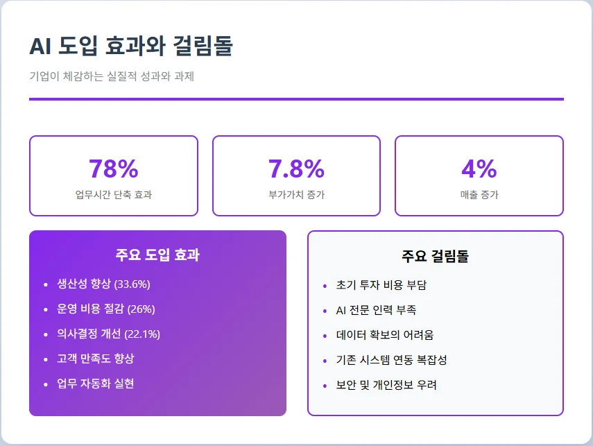 특히 AI를 도입한 기업은 미도입 기업 대비 부가가치 7.8%, 매출 4% 증가라는 명확한 수치적 성과를 보여주고 있습니다.
