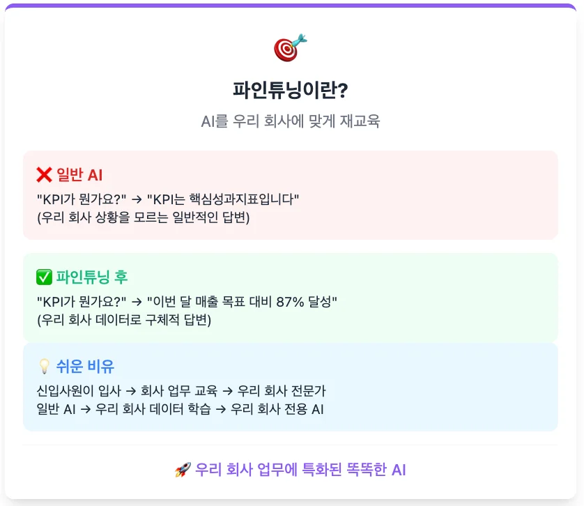 일반적인 AI를 우리 회사의 업무와 용어에 맞게 추가 교육시키는 과정입니다. 신입사원이 입사 후 회사 업무를 배우는 것과 비슷합니다.