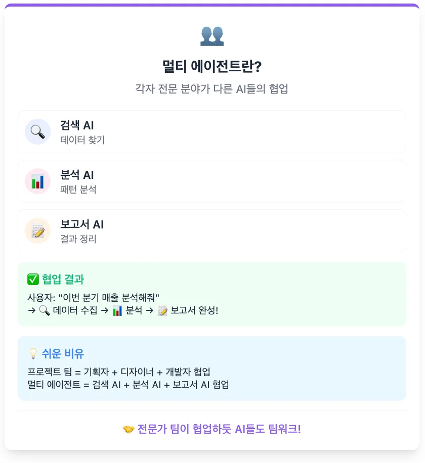 서로 다른 역할을 담당하는 여러 AI가 팀을 이뤄 협업하는 시스템입니다. 마치 한 부서에 기획자, 디자이너, 개발자가 각자 전문 분야를 담당하는 것과 같습니다.