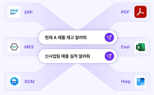 ERP, MES, CRM에 흩어진 데이터를 물리적으로 통합하려면 수억 원과 수개월이 걸립니다. 하지만 논리적으로 연결하고, 자연어로 조회 가능하게 만들면 평균 1.5개월 이내에 전사 적용이 가능합니다.