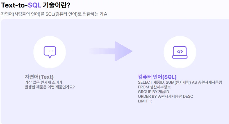 SQL을 배우라고 강요하면 아무도 안 합니다. 자연어로 질문할 수 있어야 합니다. Text-to-SQL 기술은 "지난 3개월 제품별 매출 순위"라는 질문을 자동으로 SQL 쿼리로 변환하고 실행합니다.