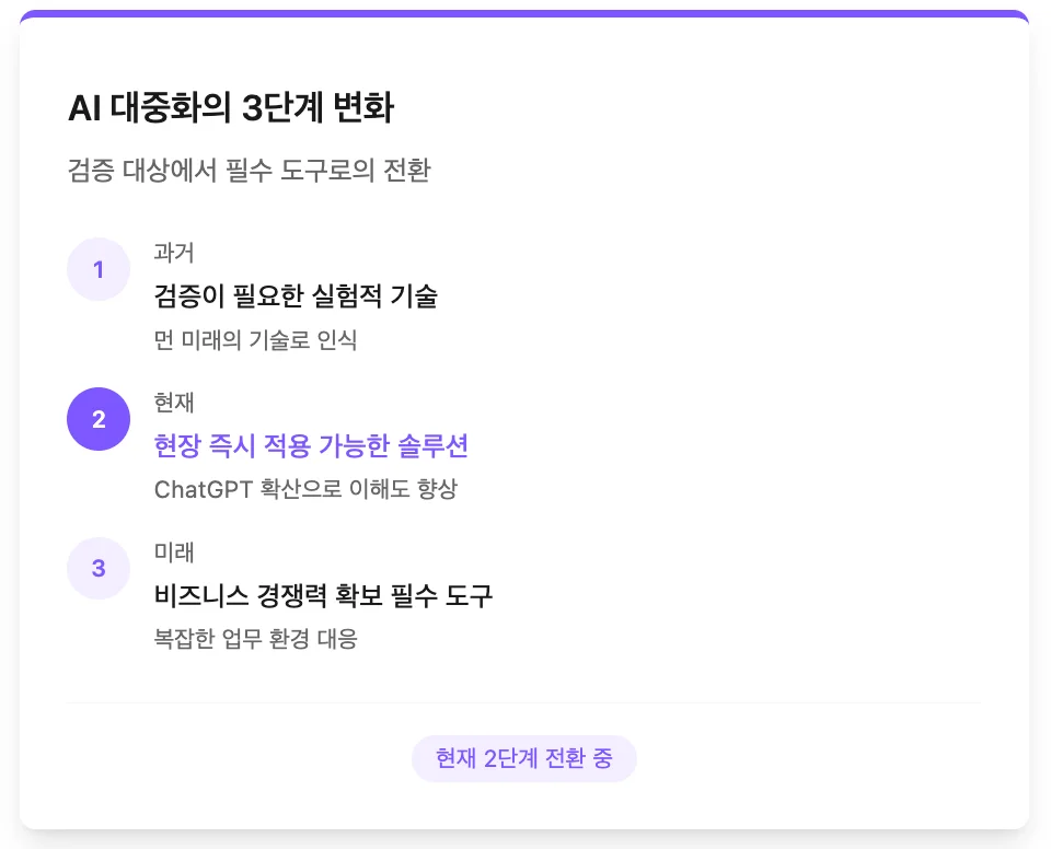 이러한 변화는 AI 시장 전체가 이론적 검토 단계에서 실제 적용 및 활용 단계로 빠르게 전환되고 있음을 의미합니다. AI는 더 이상 검증이 필요한 실험적 기술이 아닌, 비즈니스 경쟁력 확보를 위한 필수 도구로 인식되고 있는 것입니다.