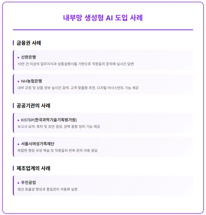 내부망 생성형 AI는 이미 많은 기업과 기관에서 사용하고 있으며, 그 사례가 점점 늘어나고 있습니다.