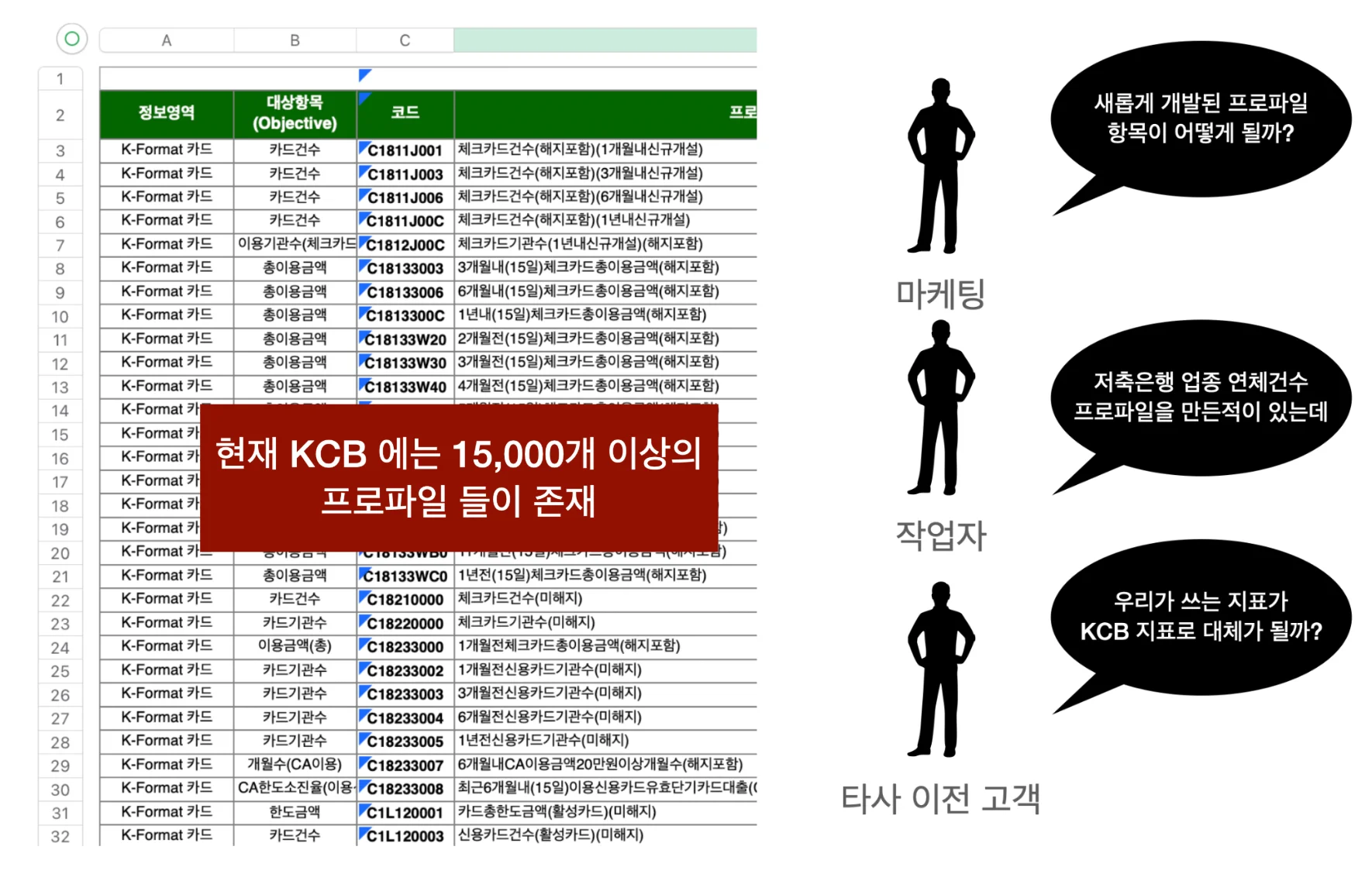 KCB는 수만 개의 신용분석 지표를 관리합니다. ‘최근 6개월 신용카드 사용 금액’, ‘저축은행 업종 대출 연체 기록’, ‘1년 내 체크카드 최고 이용금액’ 같은 지표들입니다. KCB는 이런 지표 하나하나를 ‘프로파일’이라 부릅니다.