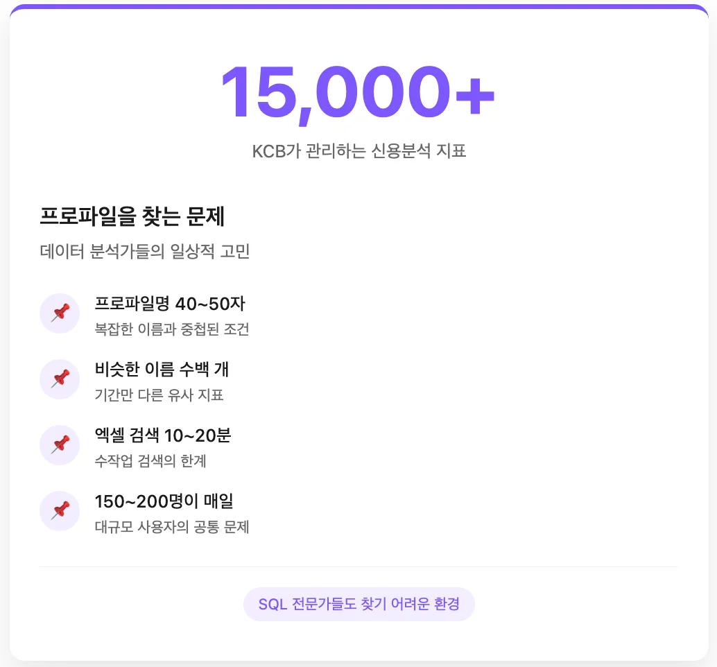 150~200명의 SQL 사용자들은 매일 복잡한 프로파일명과 코드 속에서 필요한 지표를 찾아야 했습니다. 프로파일명이 40~50자가 넘고 비슷한 이름의 지표가 수백 개씩 존재했습니다.