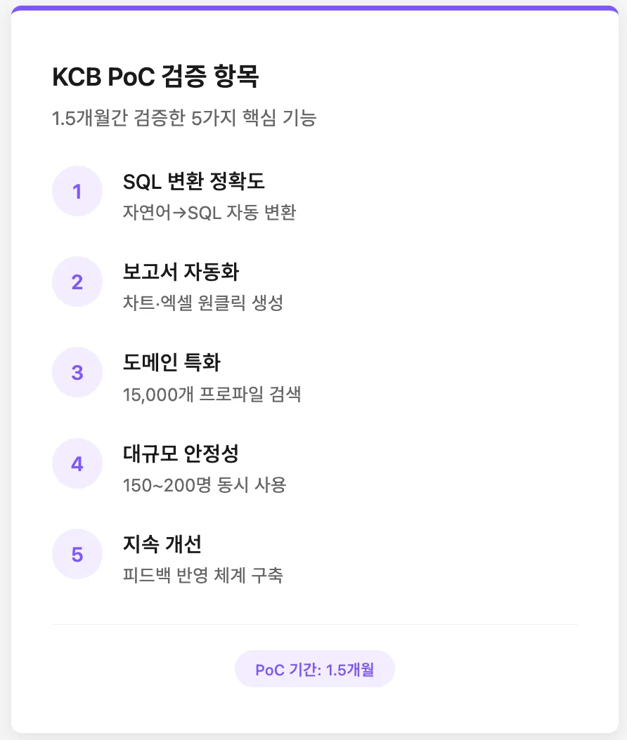 KCB는 150~200명 규모의 SQL 사용자를 위해 DARVIS를 선택했습니다. 1.5개월 PoC를 통해 Text-to-SQL 에이전트, 보고서 자동화, 금융 도메인 특화, 권한 관리 등 핵심 기능을 검증했습니다.
