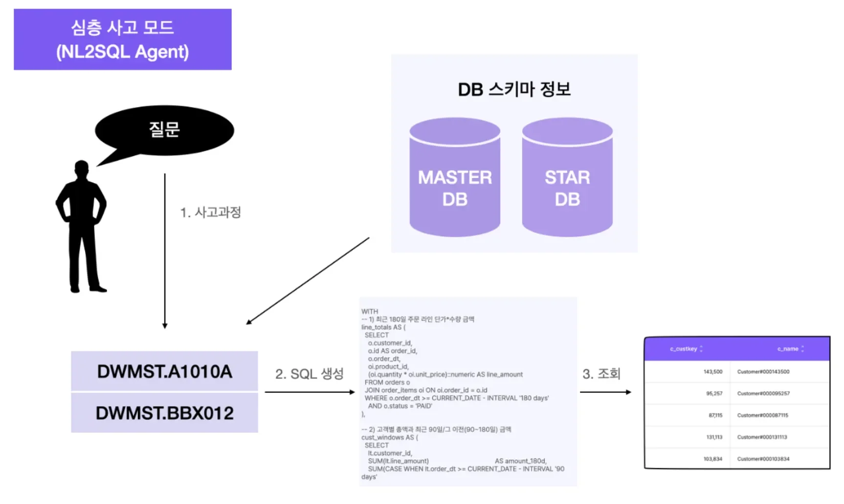 데이터 분석가가 "최근 3개월 카드 사용 금액 상위 고객 10명"이라고 입력하면, DARVIS는 적절한 테이블을 찾고, JOIN 구문을 작성하고, 집계 함수를 적용한 SQL을 생성합니다.