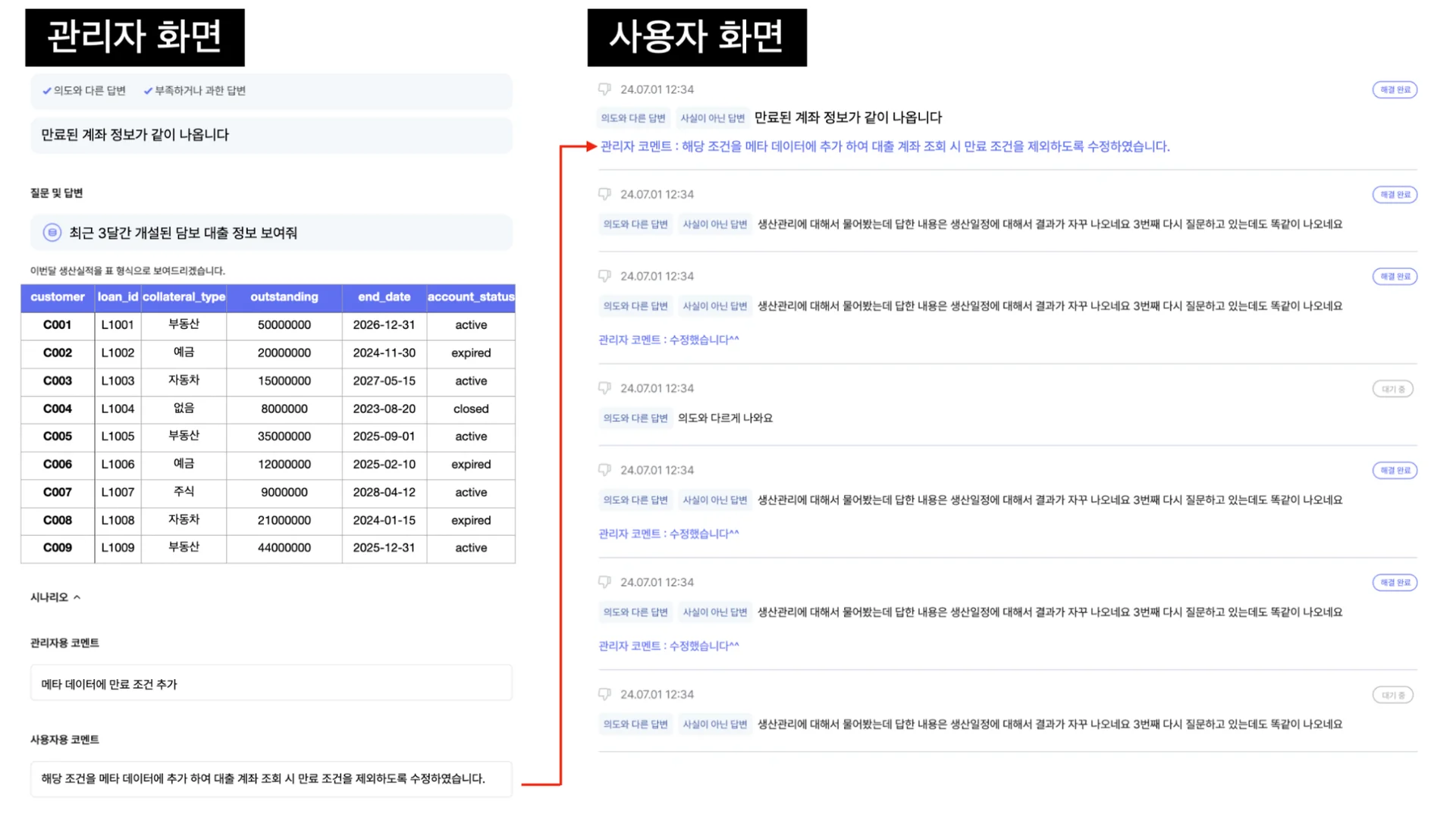 사용자가 불만족스러운 결과를 보고하면, 관리자가 실제 생성된 쿼리와 결과를 확인합니다. 문제점을 파악한 후 메타데이터를 수정하고, 다음 검색부터는 자동으로 개선된 결과가 나타납니다.
