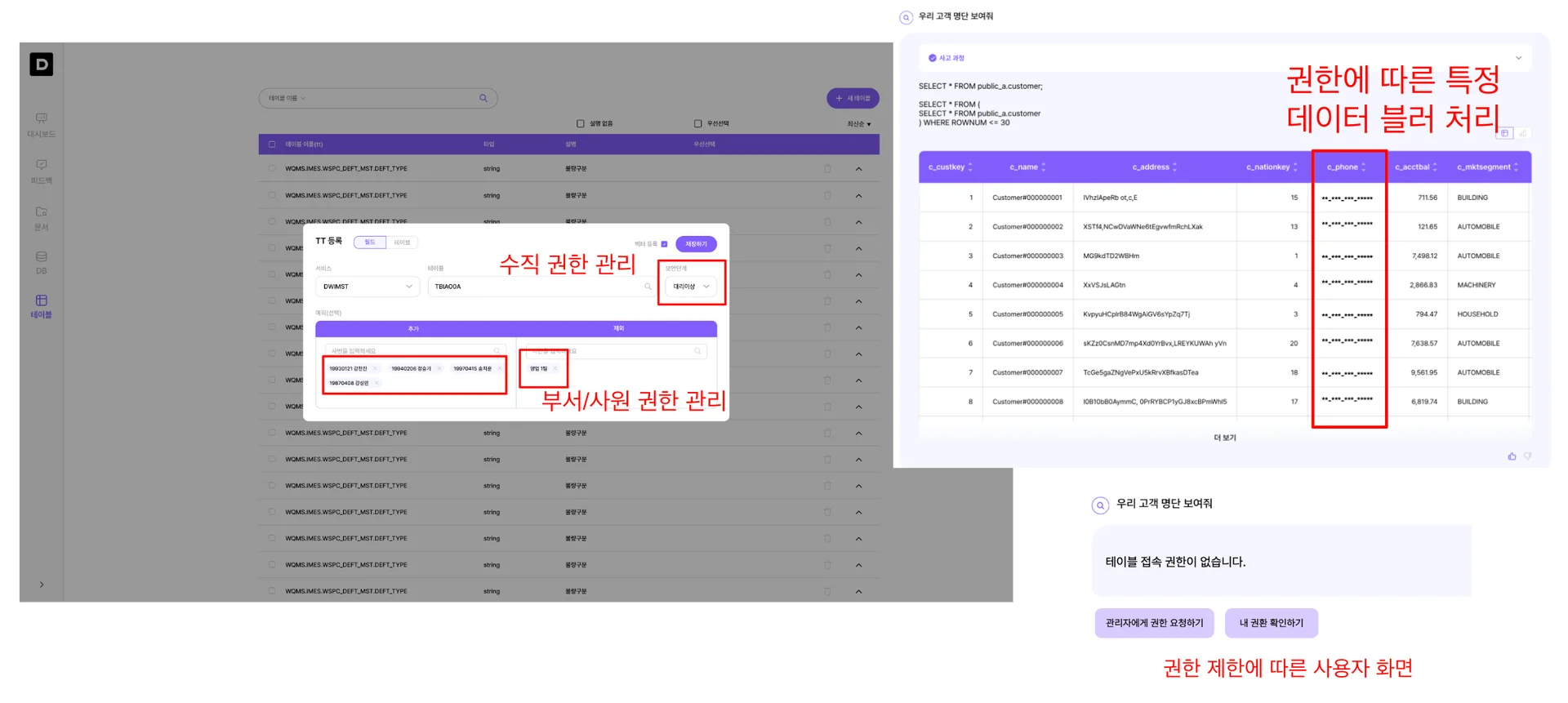 권한이 없는 데이터는 자동으로 마스킹 처리되며, 필요시 관리자에게 권한을 요청할 수 있습니다.