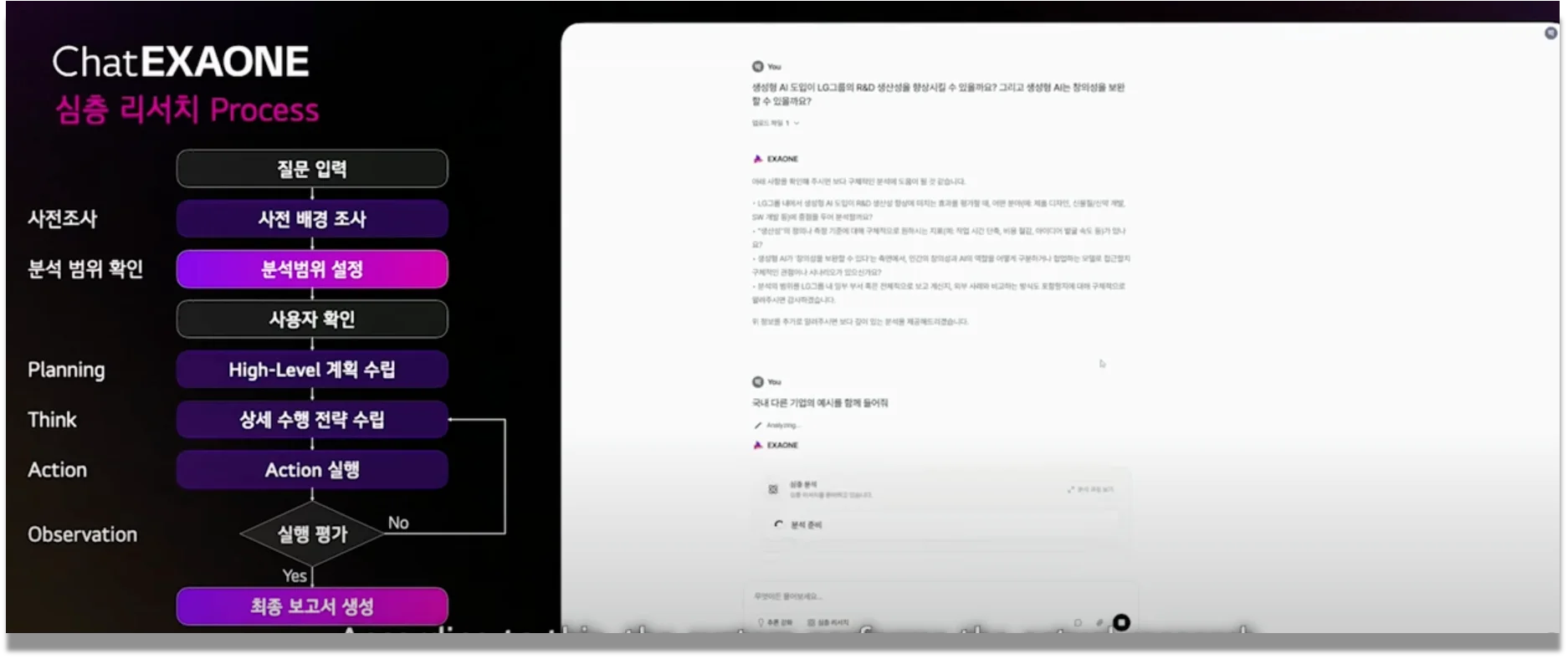 챗엑사원의 가장 강력한 기능은 심층 리서치(딥리서치) 모드입니다. 사용자가 복잡한 질문을 하면 AI가 다음 프로세스를 자동으로 수행합니다.