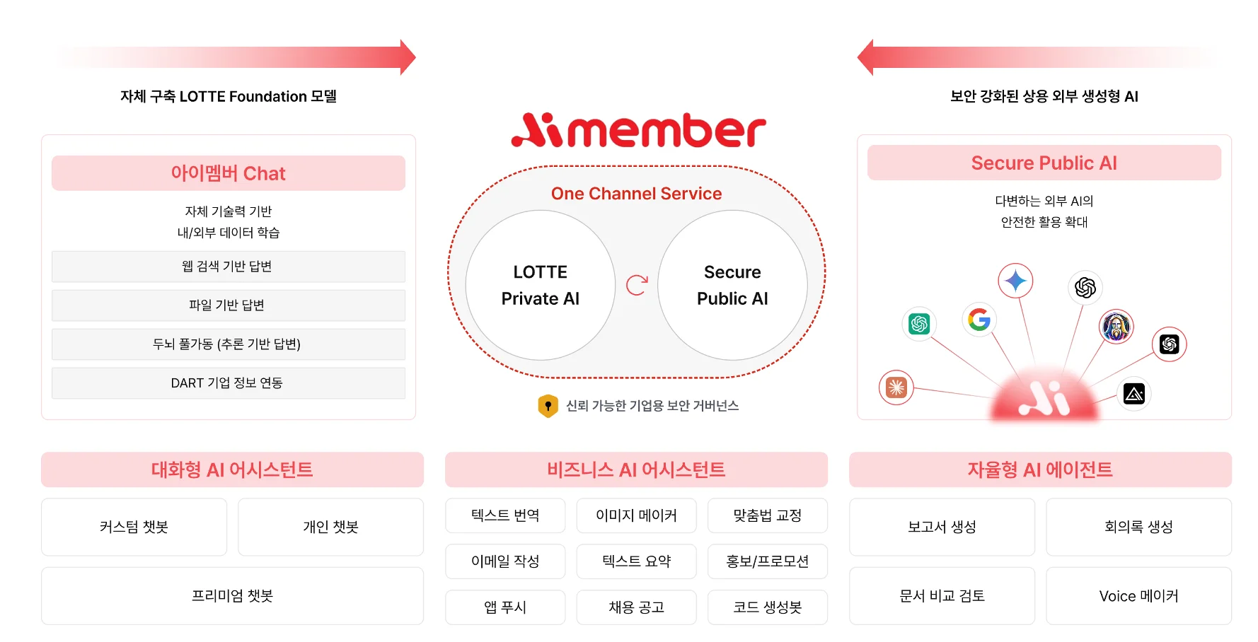 아이멤버는 자체 구축한 'LOTTE Foundation 모델' 기반의 프라이빗 AI와 보안 강화된 상용 외부 AI를 통합한 One Channel Service 구조입니다.