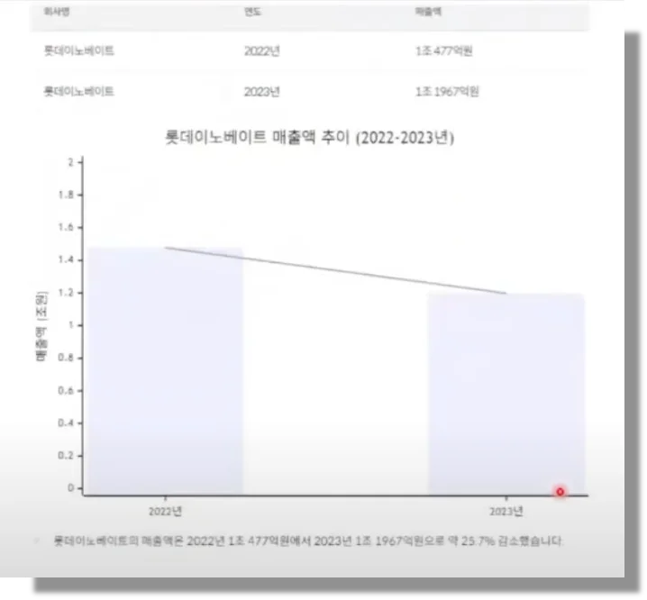 아이멤버(롯데GPT)의 답변: 정확한 원화 단위 표기, 깔끔한 수치 정리, 한국 기업 맥락에 맞는 분석, 시각화 자료(차트) 자동 생성