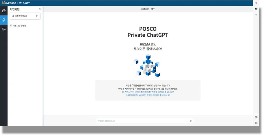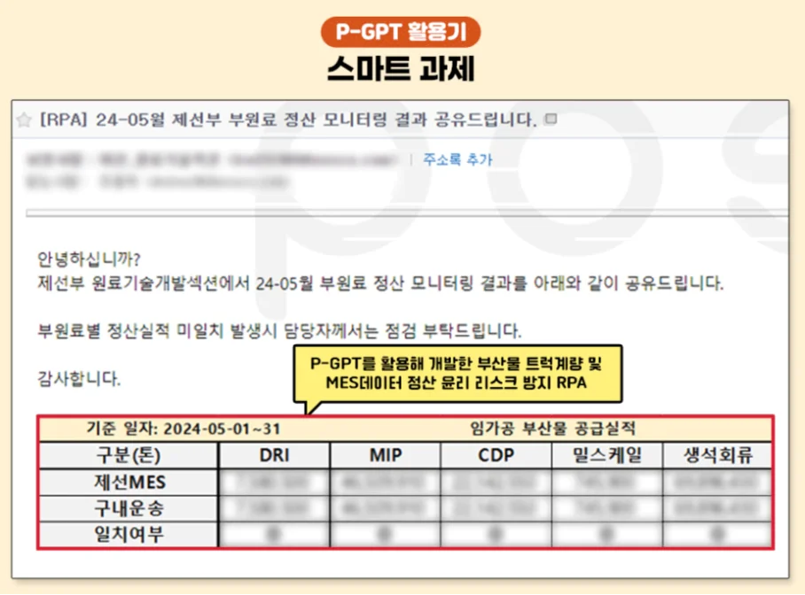 포스코는 2023년 9월부터 P-GPT를 도입했으며, 2025년 초에는 외부 전문기업과 협업한 웍스AI를 추가로 도입했습니다. 이는 제조업에서의 대기업 AI 활용 사례로 주목받고 있습니다.
