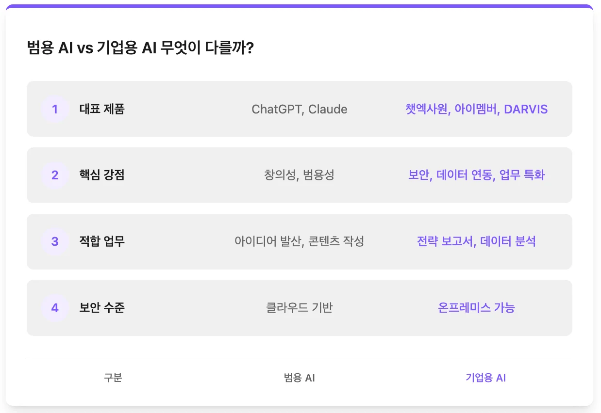 범용 AI(ChatGPT, Claude 등)는 일반적인 지식과 창의적 작업에 강점이 있지만, 기업용 AI(챗엑사원, 아이멤버, P-GPT 등)는 보안, 데이터 연동, 업무 특화에 강점이 있습니다.