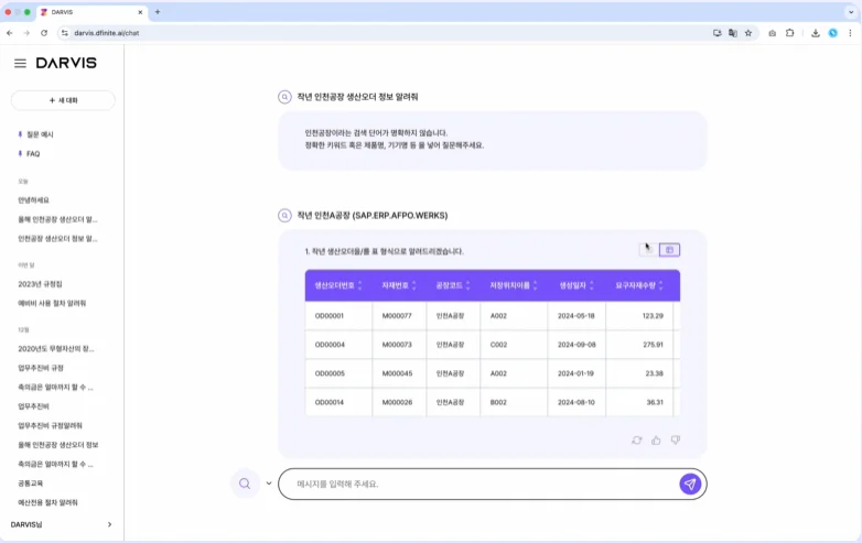 디피니트의 다비스(DARVIS)는 이러한 조건을 충족하는 기업용 온프레미스 LLM 플랫폼입니다. 사내 문서 RAG, ERP 연동 Text-to-SQL, AI GUARDIA 보안 시스템을 통합 제공하며, 금융·제조·공공 기관의 구축 경험을 보유하고 있습니다.