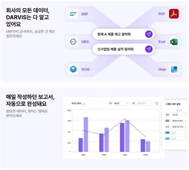 더 나아가 다비스(DARVIS)는 기업의 전문 용어와 업무 맥락을 학습합니다. "우리 팀 이번 달 목표 달성률은?"이라고 물으면, '우리 팀'이 어떤 조직 코드인지, '목표'가 어떤 지표를 의미하는지 자동으로 파악합니다. IT 담당자가 아니어도 누구나 필요한 데이터를 즉시 확인할 수 있는 환경이 만들어지는 것입니다.