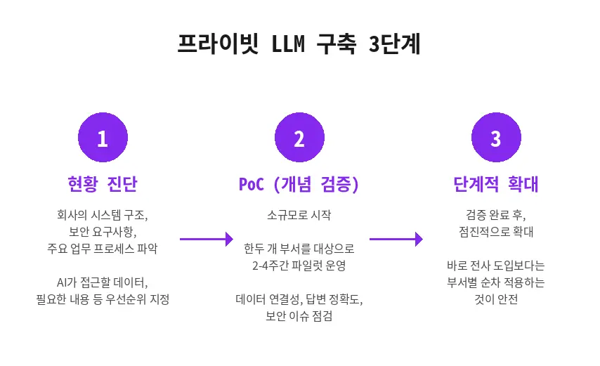 프라이빗 LLM 구축이 처음이라면 다음 단계로 접근하는 것을 권장합니다.