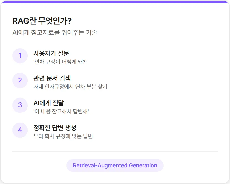 RAG는 Retrieval-Augmented Generation의 약자로, 쉽게 말해 'AI에게 참고자료를 쥐여주는 기술'입니다.