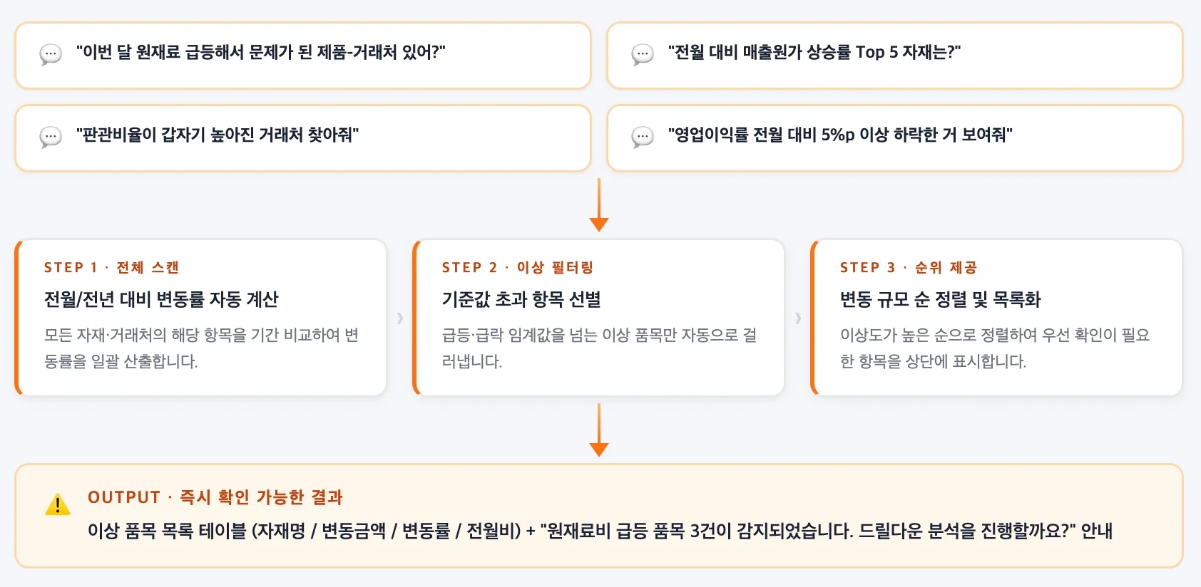 문제: L사는 제품별 재고 과부족이 발생할 때마다 생산 조율이나 마케팅 캠페인을 진행해야 했는데, 그 판단이 대부분 담당자의 감에 의존하고 있었습니다. 태블로 같은 BI 도구를 이미 쓰고 있었지만, 실시간 모니터링이 되지 않았고 왜 원가가 올랐는지, 어디서 변동이 생겼는지에 대한 원인 분석은 할 수 없었습니다.