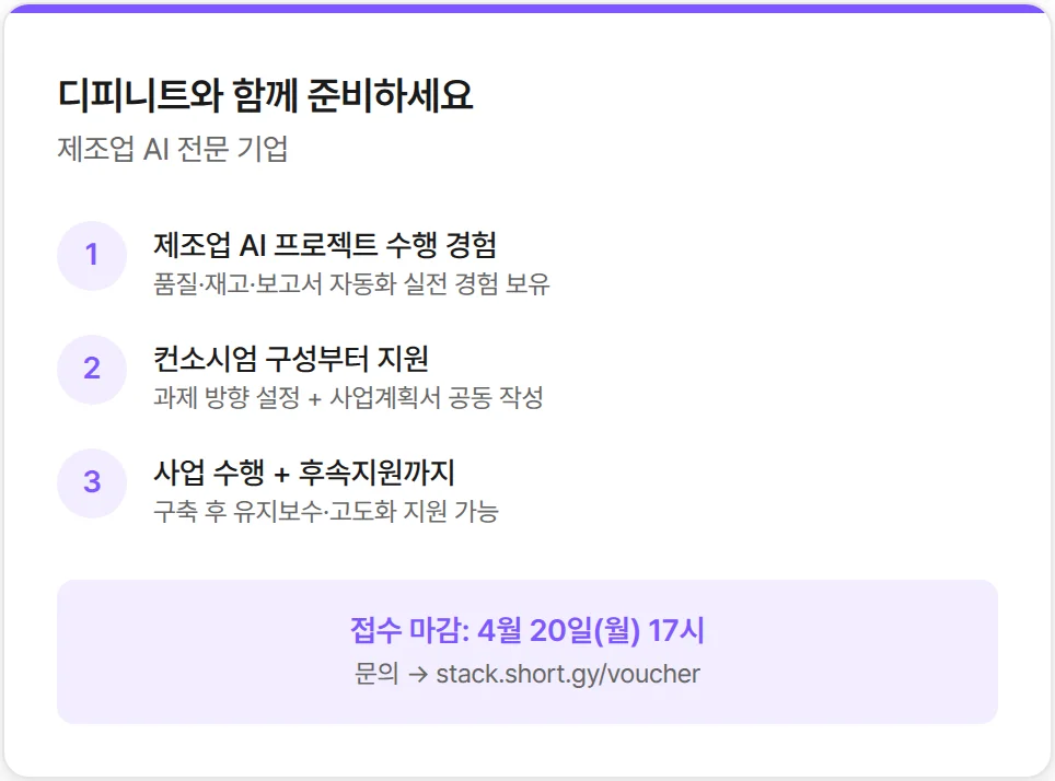 스마트팩토리 지원사업을 활용한 AI 도입을 검토 중이라면, 아래 링크에서 간단한 정보를 남겨주시기 바랍니다.