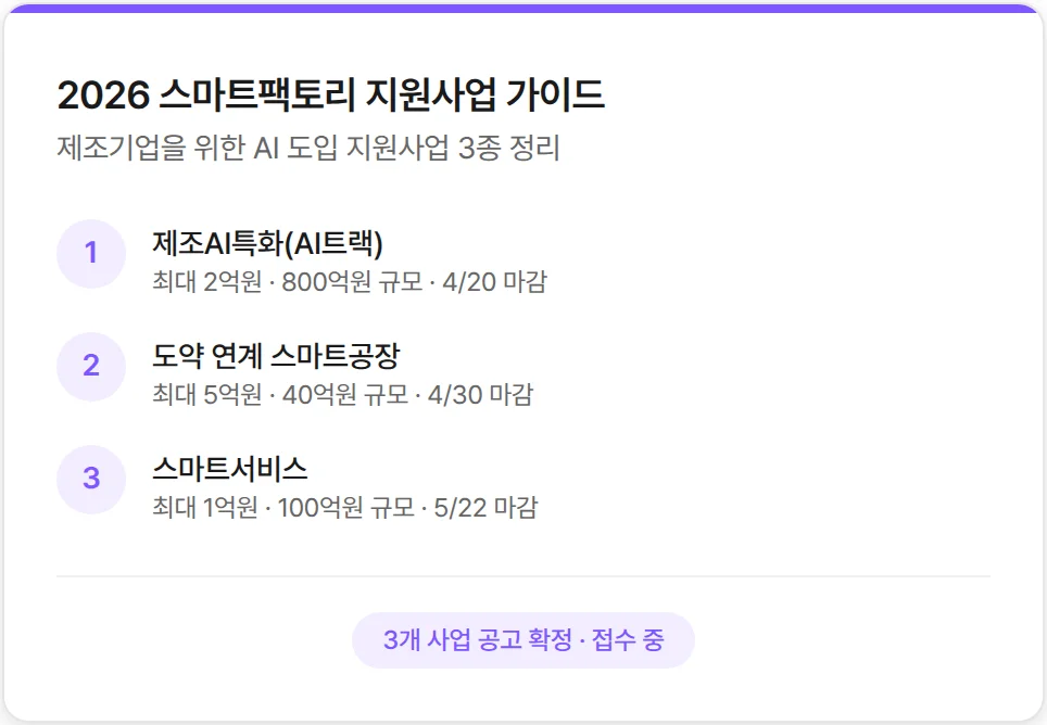 제조AI특화, 도약 연계, 스마트서비스, 정부형, 자율형공장 등 이름만 봐서는 차이를 알기 어렵고, 사업마다 지원 대상과 금액, 신청 시기가 다릅니다. 게다가 2026년 기준으로 공고가 나온 사업과 아직 나오지 않은 사업이 섞여 있어서 혼란스러울 수 있습니다.