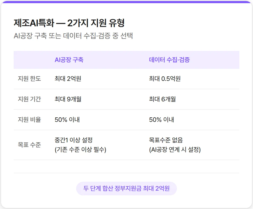 제조AI특화 2026년 공고: https://www.bizinfo.go.kr/sii/siia/selectSIIA200Detail.do?pblancId=PBLN_000000000120109