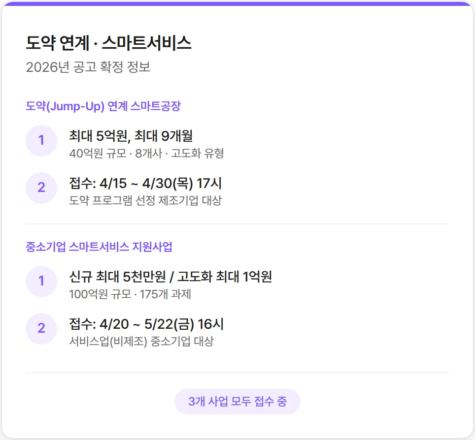 스마트서비스 2026년 공고: https://www.smart-factory.kr/usr/bg/ba/ma/bsnsPbancDtl?pbancId=2026-N-0064&pbancSn=1