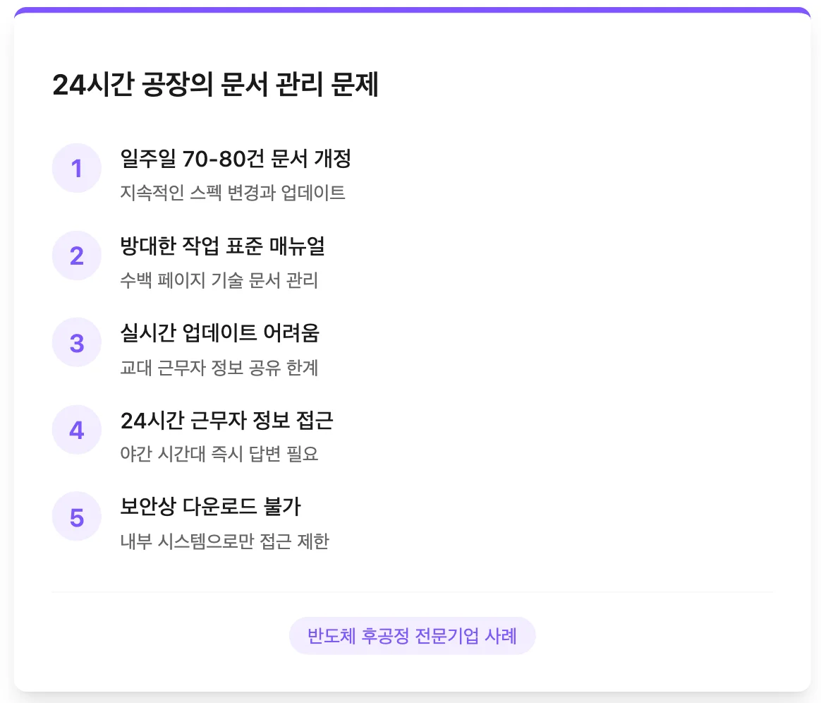 여기서 핵심은 단순히 문서가 많다는 것이 아니었습니다. 제조업 특성상 안전과 품질에 직결되는 정보들이 실시간으로 업데이트되는데, 이를 모든 교대 근무자들이 놓치지 않고 적용해야 한다는 점이었습니다.
