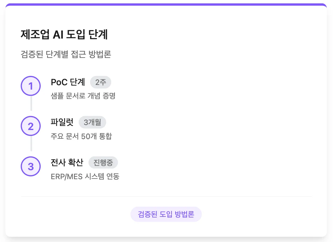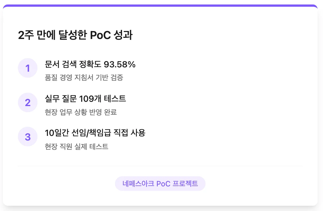 샘플 문서 2-3개로 개념 증명을 진행합니다. 네패스아크처럼 실제 업무에서 사용하는 핵심 문서를 선정해서 AI가 얼마나 정확하게 이해하고 답변할 수 있는지 검증하죠.